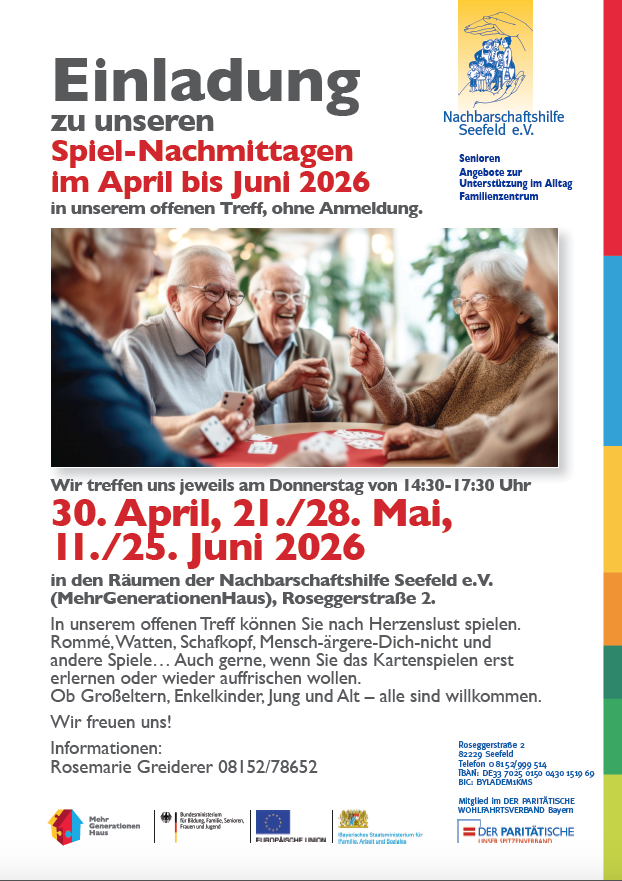 Wir treffen uns jeweils am Donnerstag von 14:30-17:30 Uhr in den Räumen der Nachbarschaftshilfe Seefeld e.V. (MehrGenerationenHaus), Roseggerstraße 2.
