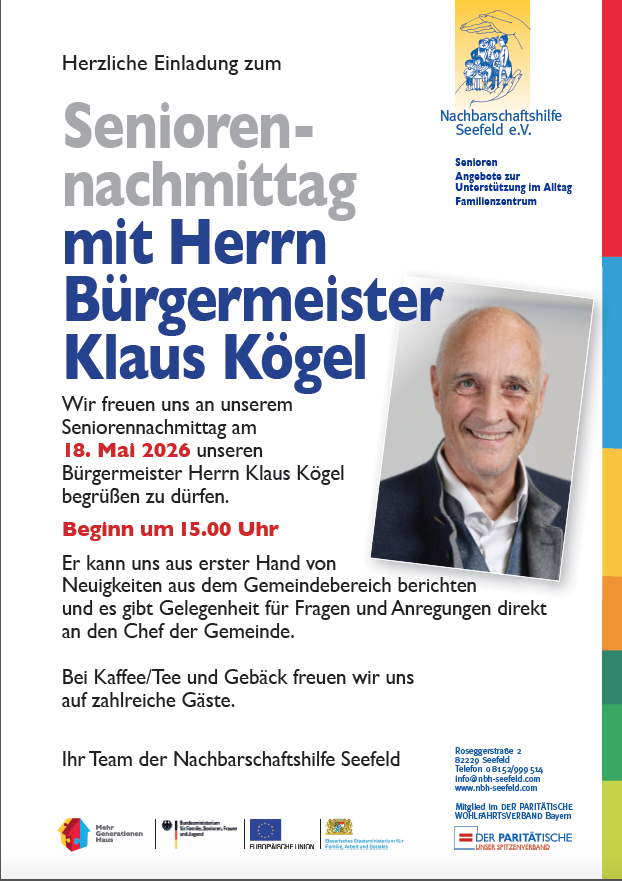 Wir freuen uns an unserem Seniorennachmittag am 18. Mai 2026 unseren Bürgermeister Herrn Klaus Kögel begrüßen zu dürfen.